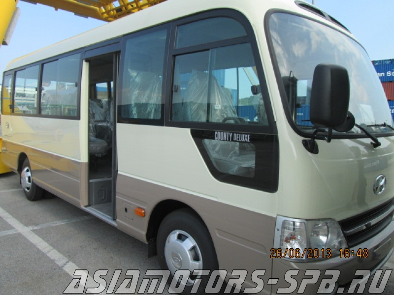 Туристический Автобус HYUNDAI COUNTY DELUXE (LONG BODY), 2013 г.в.( новый)!!!!!!! 29 мест. Комплектация, двигатель D4DD: Дизель турбированный интеркулер Euro3, объем 3907 см3, МКП 5 ст., механическая, кондиционер, горный тормоз, покрытие пола – линолеум (серый), тонировка боковых окон, пассажирские сидения отделка винил (серый), 2-х точечные ремни безопасности, магнитола, часы, стандартный обогреватель салона, вентиляционный люк.